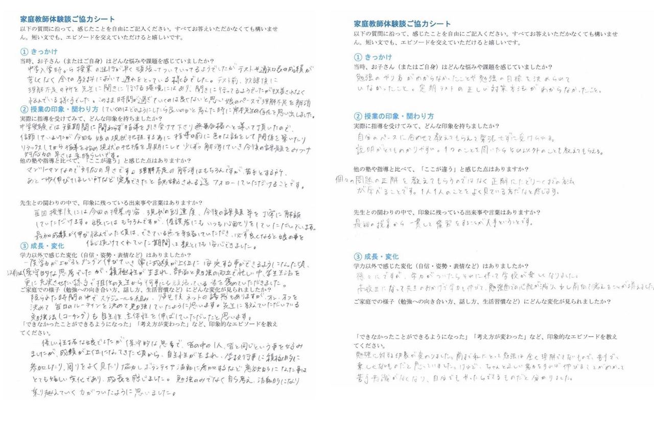 ここでは、実際に通われた生徒・保護者の皆さまの声を、
